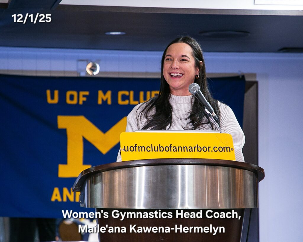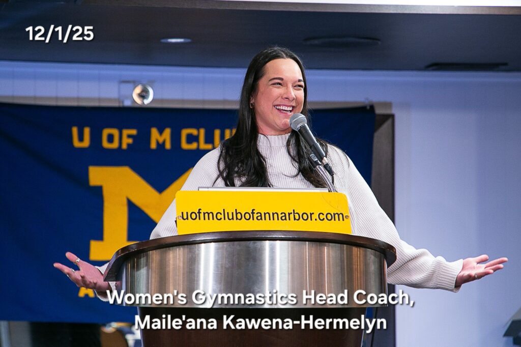 Our first speaker today was Women's Gymnastics Head Coach Maile'ana Kawena-Hermelyn. She was appointed to her head coach position this past summer and this was her first time speaking to us as a head coach. What an amazing speaker she is and she was enjoyed by our members. Women's Gymnastics begins its 2025-2026 schedule on Friday December 12, 2025.
