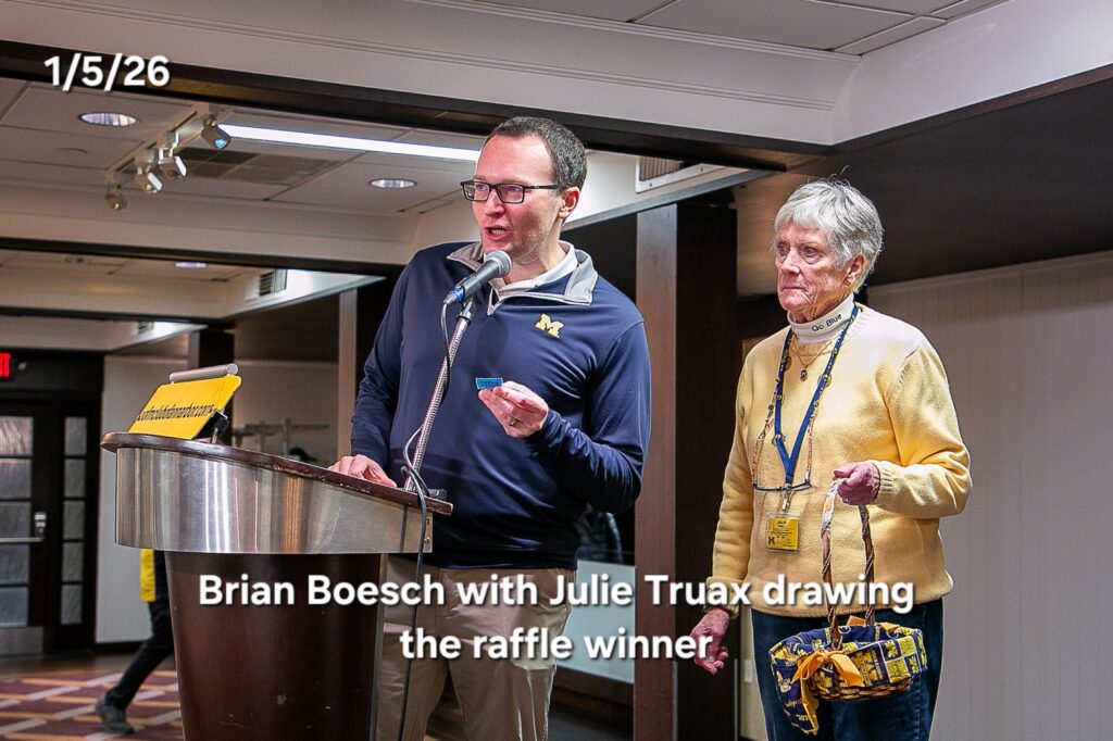Coach Tress is drawing the ticket for the 50/50 raffle winner. Remember that the U of M Club of Ann Arbor uses 50% for scholarships and 50% of the proceeds is paid to the raffle drawing winner!!! Be sure to buy raffle tickets every week!